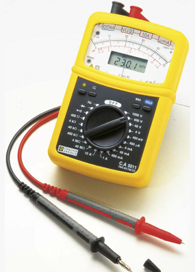 5011指針型萬用表 產(chǎn)品編號:P0119631 產(chǎn)品介紹 CA5011真有效值數(shù)字萬用表,無論被測信號是正弦還是非正弦(失真),均可給出其真有效值。適用于所有類型的裝置的測量,包括那些含有所謂非線性負(fù)載的裝置。 產(chǎn)品特點 1.互補的兩種方式讀數(shù):數(shù)字讀數(shù)精確,有背光;模擬指針讀數(shù)快。 2.自動交直流(AC/DC)識別 3.AC/DC電壓:400mV 到 1,000V (5個量程) 4.頻率: 20Hz 到 10kHz 5.精度: 0.5% - 阻抗:10MΩ 6.AC/DC電流: 4